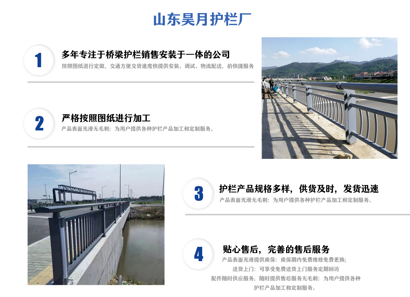 山東昊月金屬制品有限公司坐落于原材料豐富人文和諧交通發(fā)達及有“江北水城”之稱——聊城。 公司以科技興廠為宗旨,積極引進人才和技術,不斷開拓創(chuàng)新. 主營產(chǎn)品:SS級橋梁防撞護欄,不銹鋼復合管護欄,鋁合金護欄,燈光護欄,河道護欄等等。產(chǎn)品本公司建立了一套科學的行之有效的質(zhì)量體系,擁有一支高技術、高素質(zhì)團隊,堅持以“誠信”為本,堅持“優(yōu)質(zhì)的質(zhì)量、貼心的服務”為崇高理念,為用戶提供質(zhì)優(yōu)價廉的產(chǎn)品提供至真至誠的服務。與客戶合作雙贏、攜手共創(chuàng)輝煌。  公司以科學的工藝、嚴格的質(zhì)量管理、完善的服務理念、合理的銷售價格贏得了良好的聲譽,建立了密切和愉快的合作關系。多年來,我們一直以良好的品質(zhì)、合理的價格,完善的質(zhì)量保障體系,完善的售后服務為客戶提供周到的服務,滿足廣大客戶的需求。  我們以信譽求生存,以質(zhì)量去競爭,以真誠換合作,以效益求發(fā)展,是我們的服務宗旨。我們積極主動與同行加強交流與時俱進,邁向新的歷程!我們竭誠歡迎您的咨詢和洽談,愿與同行業(yè)的同胞們合作共贏。...